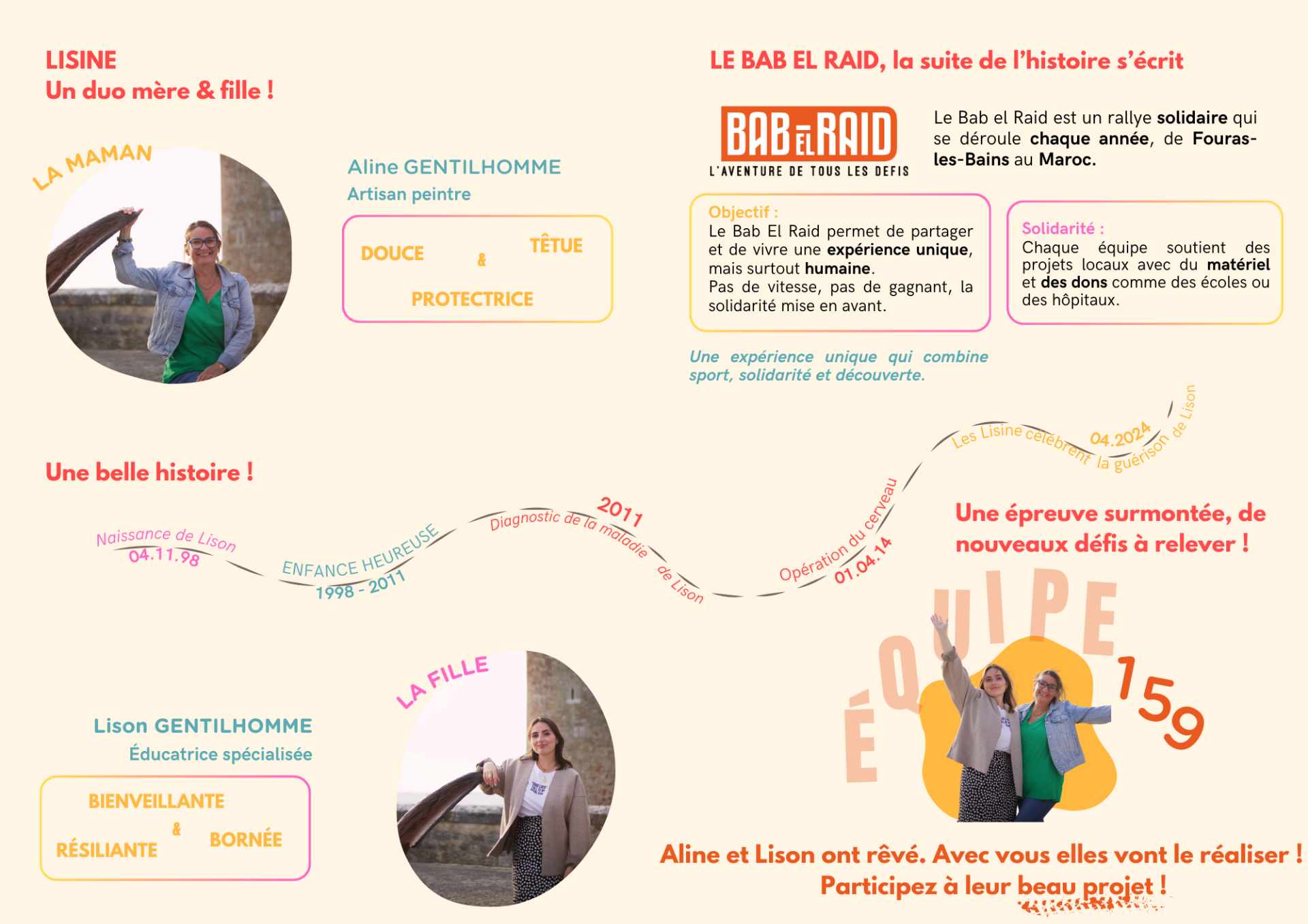 Le duo de Lison et Aline GENTILHOMME souhaitait participer au rallye du Bab El Raid 2025 et avaient besoin de sponsors pour financer l'aventure solidaire. En groupes, nous avons donc réalisé des supports de communication pour le projet (dossier de partenariat, dépliant de présentation, site web, motion design, t-shirt floqués, spot radio).